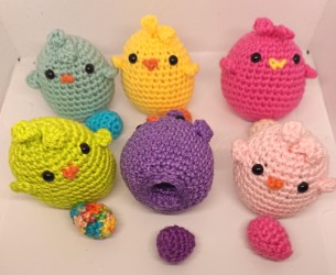 poussin avec son petit oeuf amigurumi colorés au crochet fait main, petite création artisanale en coton pour décoration ou cadeau.